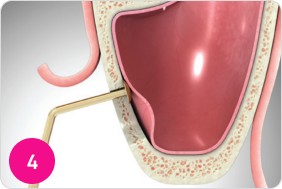 Внесите необходимо количество костного материала в сформированную полость. Закройте латеральное отверстие коллагеновой мембраной. Уложите лоскут на место и ушейте рану.